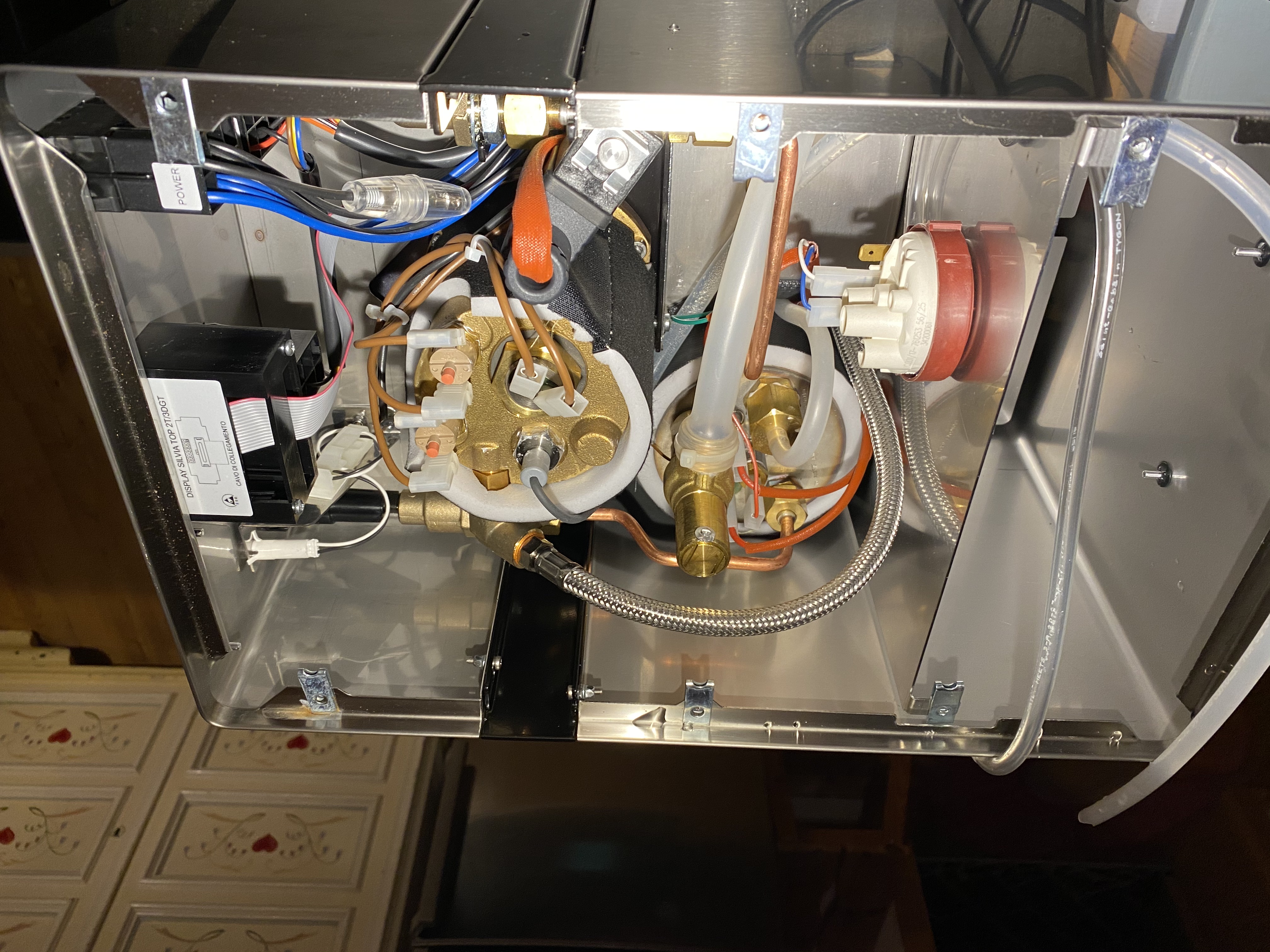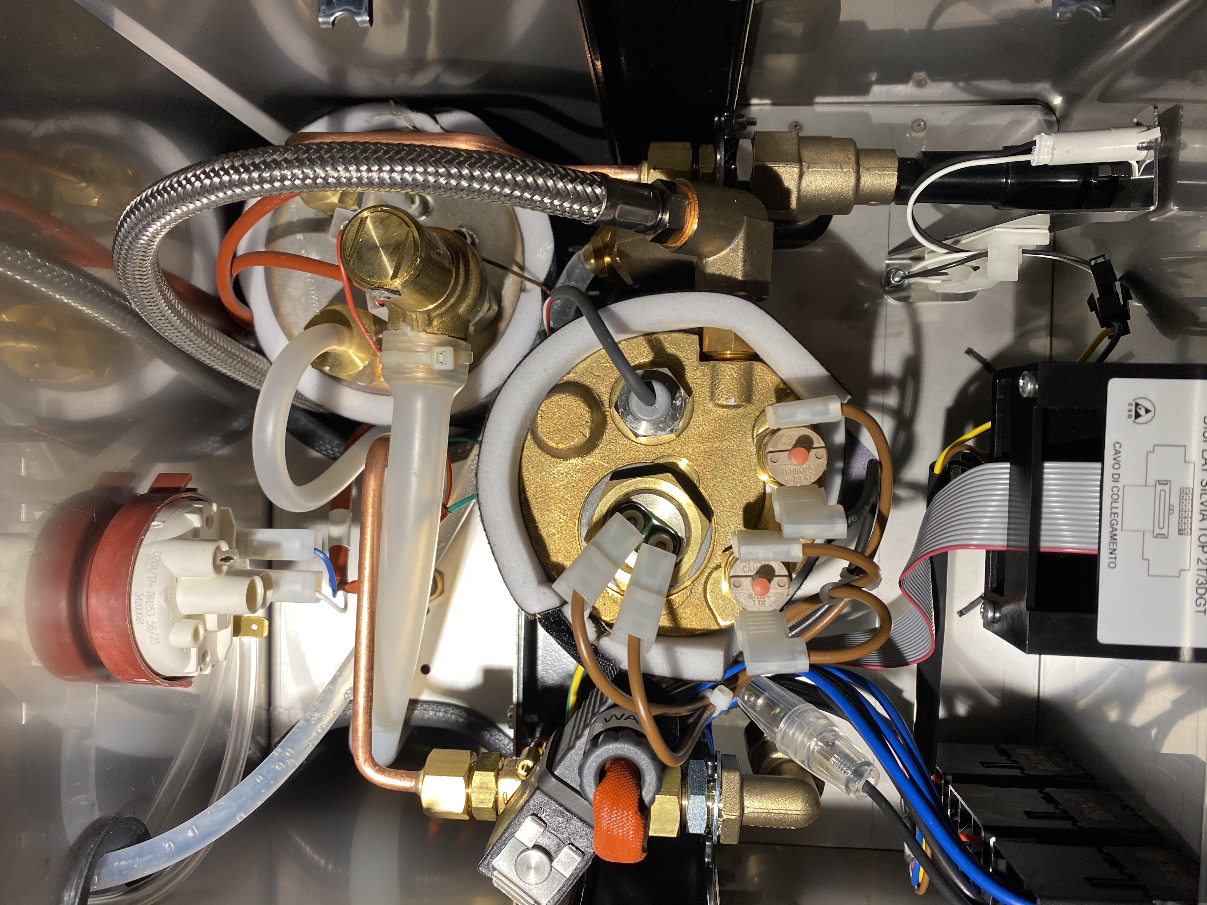 - Brühkessel mit einer Kapazität von 0,3 l aus Messing mit Edelstahlheizung. Rancilio verbaut hier inzwischen bleifreies Messing.