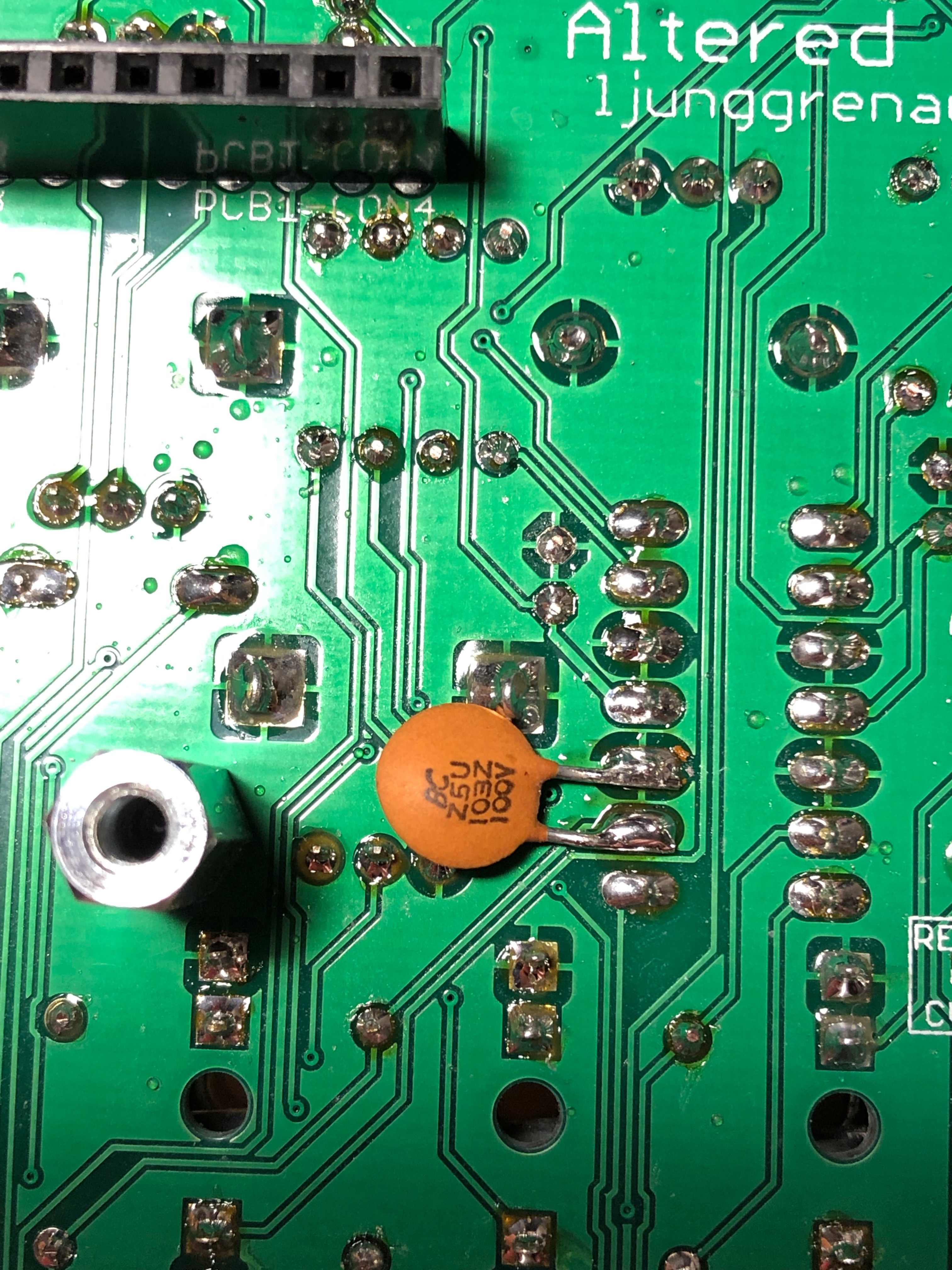 Nachdem ich das Problem einkreisen konnte, indem ich gezielt bestimmte Funktionen jeweils links und rechts getauscht habe (dafür habe ich mir ein paar Verbindungskabel für Control- und Hauptplatine gebastelt), habe ich festgestellt, dass das Problem nicht in einem fehlerhaften/falschen Bauteil oder Lötstelle liegt, sondern vermutlich dem Platinenlayout selber, in Verbindung mit gewissen Bauteiltoleranzen, geschuldet ist. Die beiden Seiten links und rechts sind layouttechnisch nämlich nicht symmetrisch. Meine Beobachtung war, dass sich im Funktionsblock für die Filter-Resonanz bei bestimmten Konstellationen eine fiese Rückkopplung bei den OPs ausbildet (extremes Knistern) Leider fehlt mir für eine genauere Analyse ein Oszi… Auf jeden Fall konnte ich das Problem dadurch lösen, indem ich einen 10nF Kondensator an dem Eingang eines der OPs gelegt habe (siehe Bild).